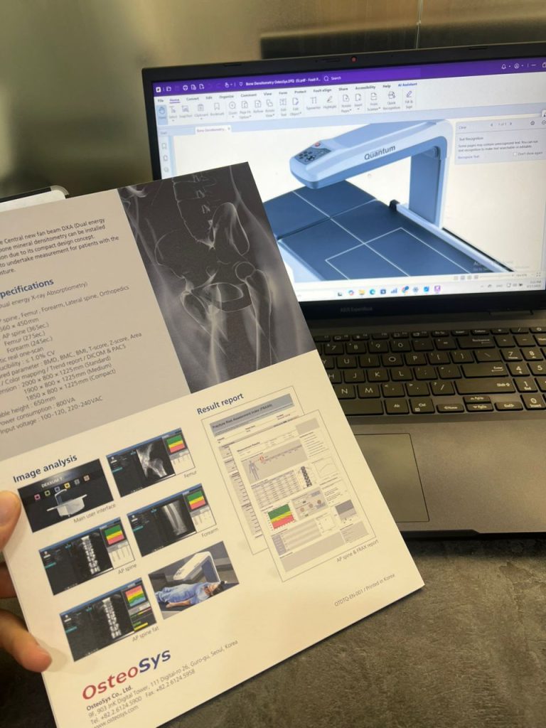دستگاه سنجش تراکم استخوان (دانسیتومتری) برند Osteosys مدل DEXXUM T Quantum، یک دستگاه پیشرفته ی سنجش تراکم استخوان (Bone Mineral Density یا BMD) با فناوری DXA و تصویربرداری به صورت Narrow Fast Fan Beam است که برای گروه پزشکان روماتولوژی، رادیولوژی و … طراحی شده تا با کمترین فضا و با راحتی بالا برای بیمار نتایج دقیق و قابل اتکایی ارائه دهد.